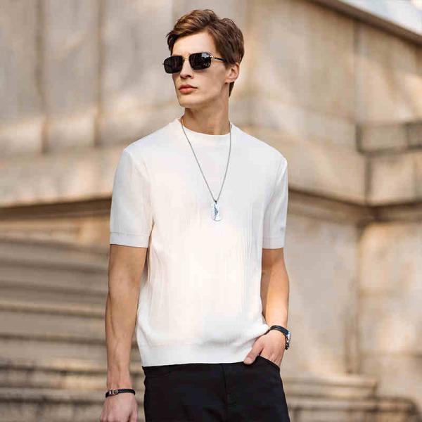 Knitted short sleeved T-shirt for men in summer, thin ice silk half sleeved sweater for men, white inner layer, single wearing base top