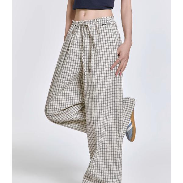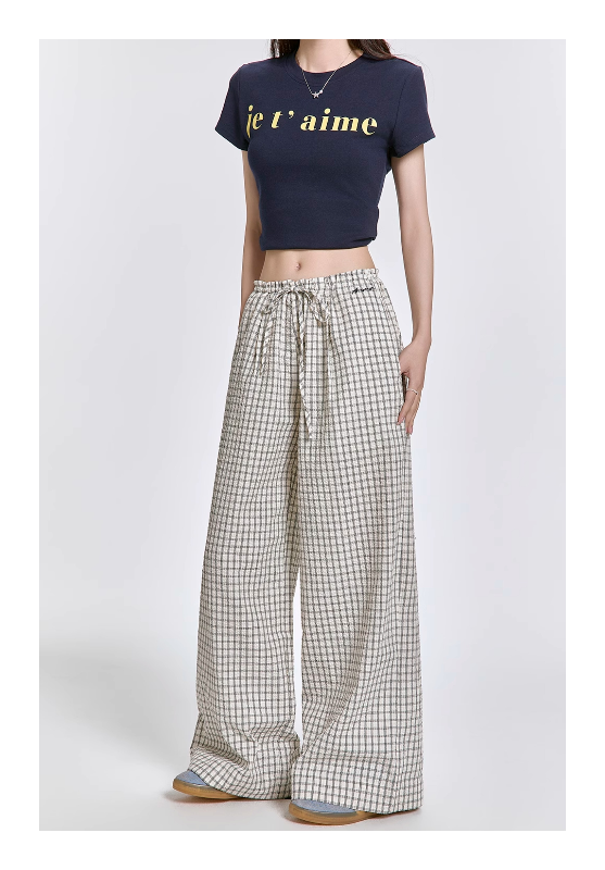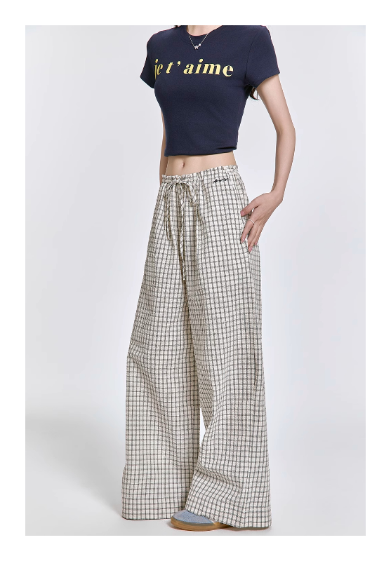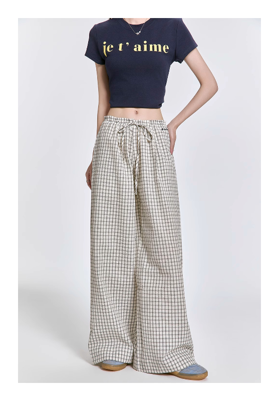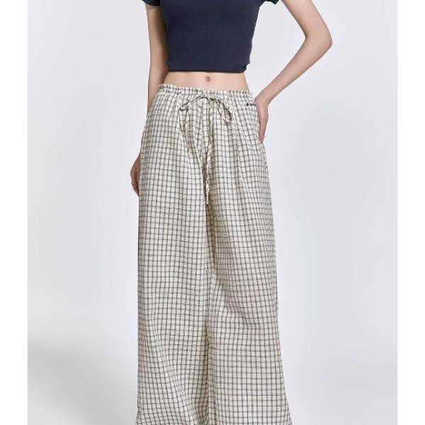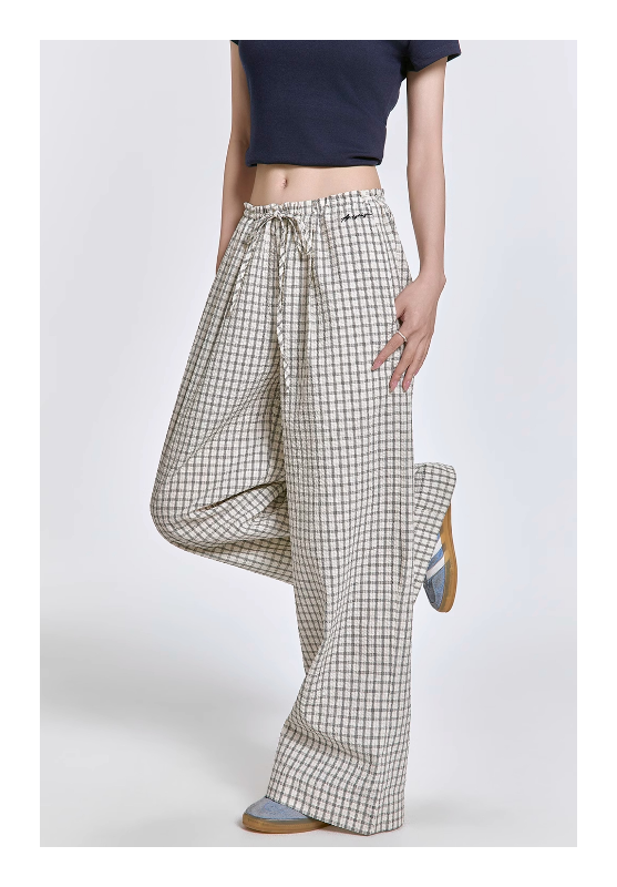 2025 new women's plaid wide-leg pants, high waist drawstring design, loose version to hide the flesh and show thinness, good drape. The fabric is comfortable and skin-friendly, suitable for daily and commuting scenes, and easily creates a lazy and fashionable feeling.