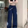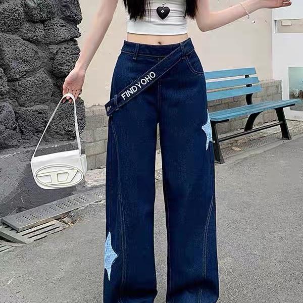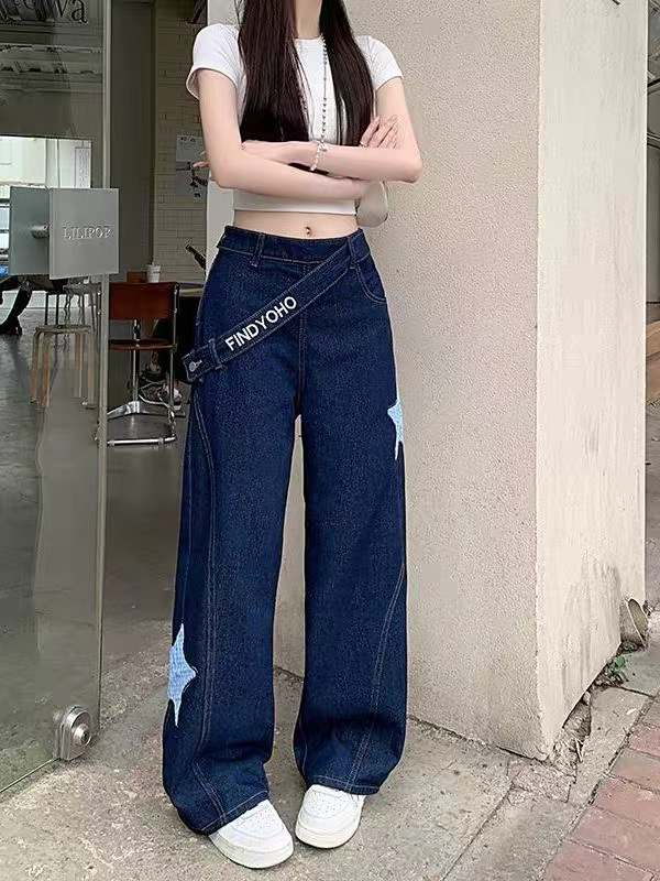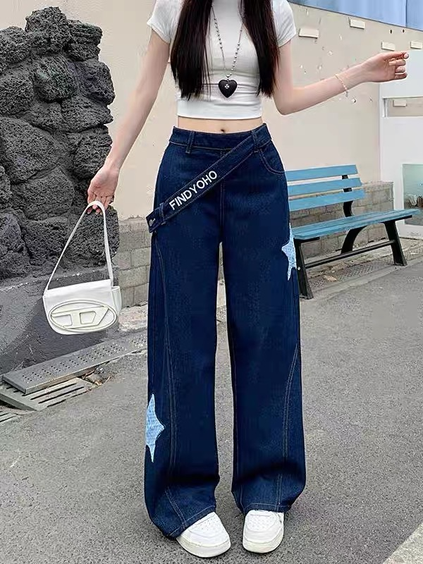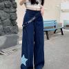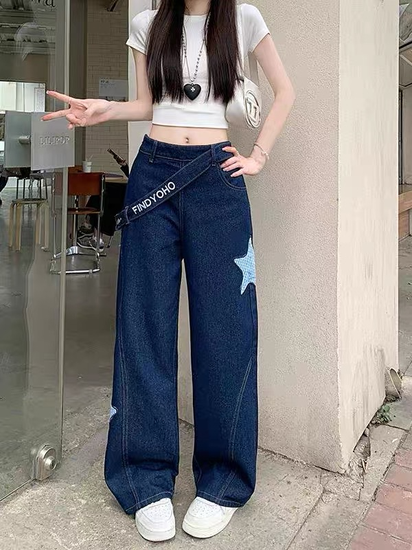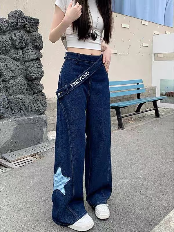 Designed denim wide-leg pants, classic dark blue denim fabric, high waist oblique button + star check patch embellishment, full of looseness. The draped wide-leg cut hides the flesh and makes the legs look longer, suitable for daily outings and trendy wear, American street style and retro style are combined in one click, easily creating a casual and fashionable feeling.
