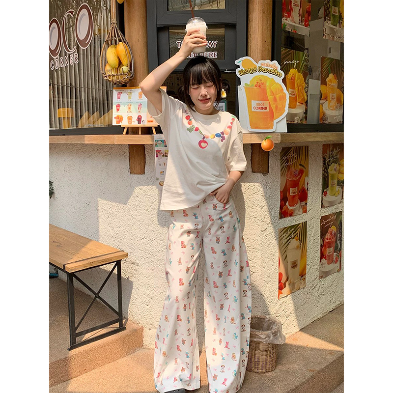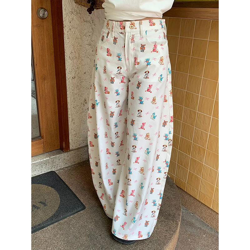 Cute style! Off-white wide-leg jeans, printed with colorful cartoon patterns, childish and eye-catching . High waist and loose version, covering the flesh and showing long legs, walking with the wind is super stylish~ Paired with a simple top for daily life, it is easy to create a relaxed feeling of age reduction, suitable for both sweet girls and retro styles, and the rate of turning heads when going out is off the charts.