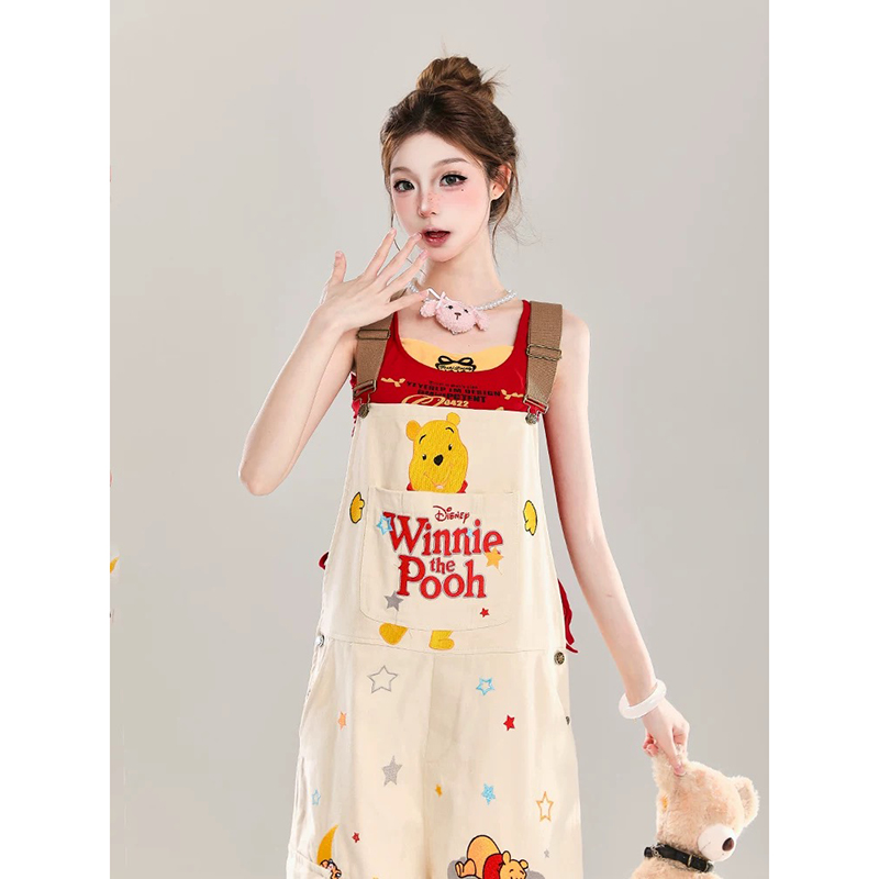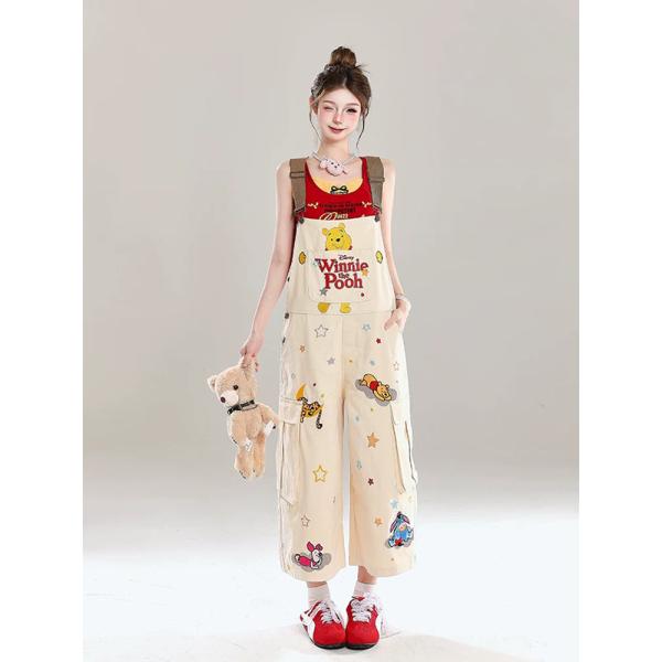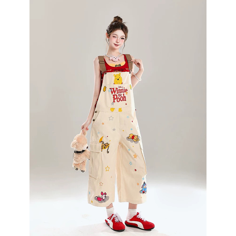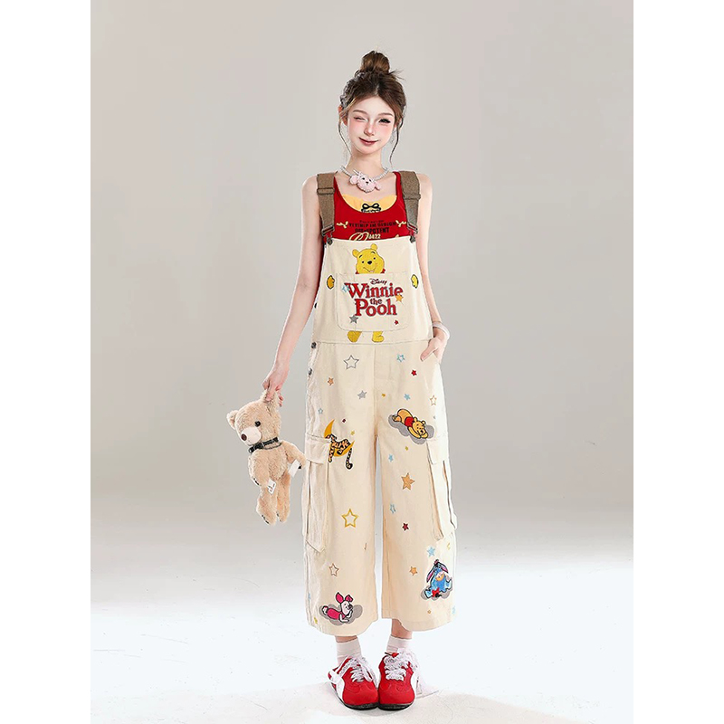 Winnie the Pooh co-branded overalls are here! The light khaki color is super fresh, and the full-print cartoon pattern is full of childishness. The large pockets + wide-leg design are cute and hide the flesh. Paired with a red top, it is full of vitality. Whether you are shopping or dating, you will instantly become a lively girl when you put it on. It is a must-have for reducing age.