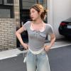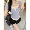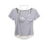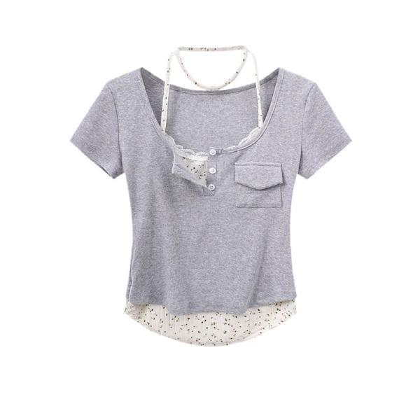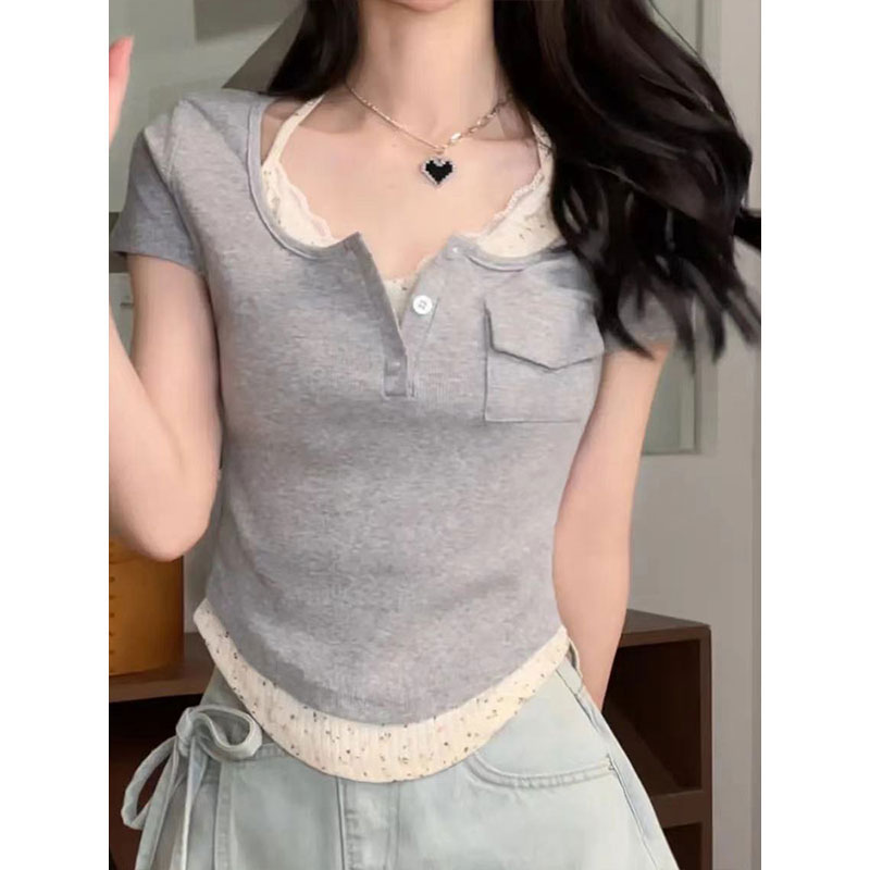 Korean style layered small suit, light gray short-sleeved cardigan, V-neck button design, with floral lace suspenders, sweet and gentle ~ the hem reveals a small skirt with a layered feel! With a black gauze short skirt and a polka dot bag, it is Korean style for daily outings, and it is easy to wear with a relaxed feel.