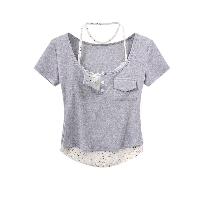 The layered design, short-sleeved cardigan + floral suspenders, create a Korean layered look and allow you to wear one piece of clothing in multiple ways.