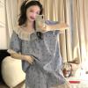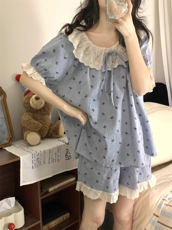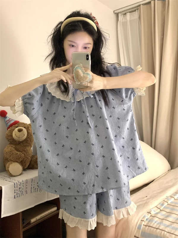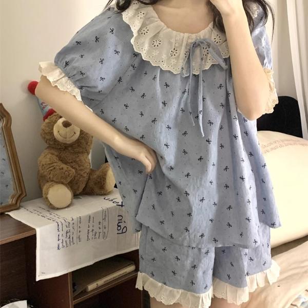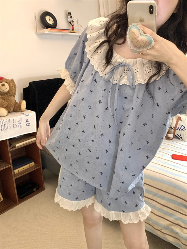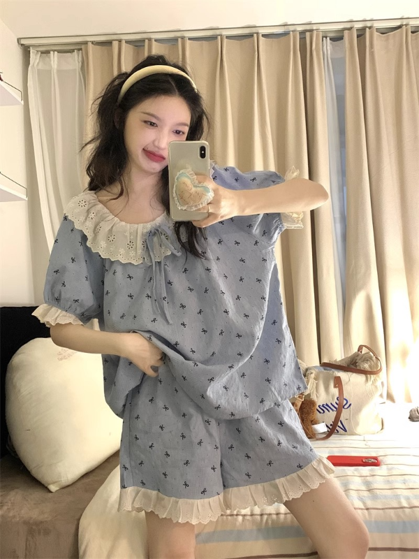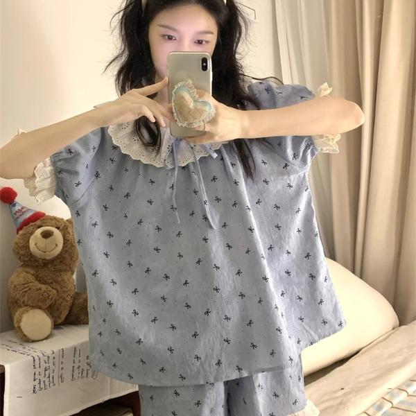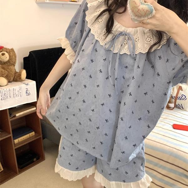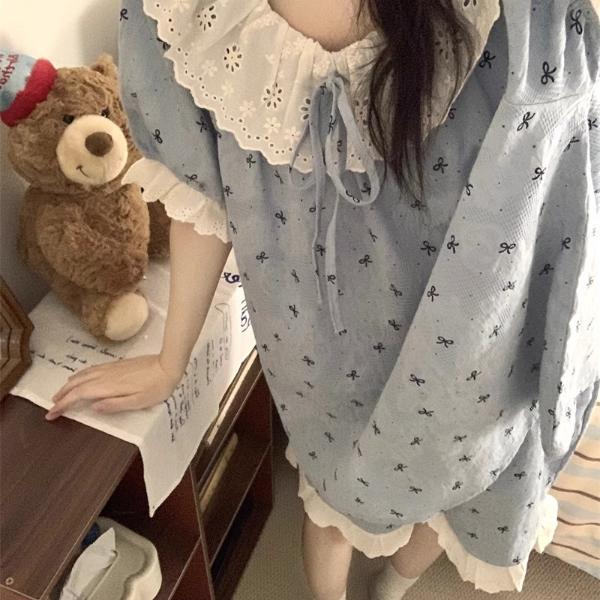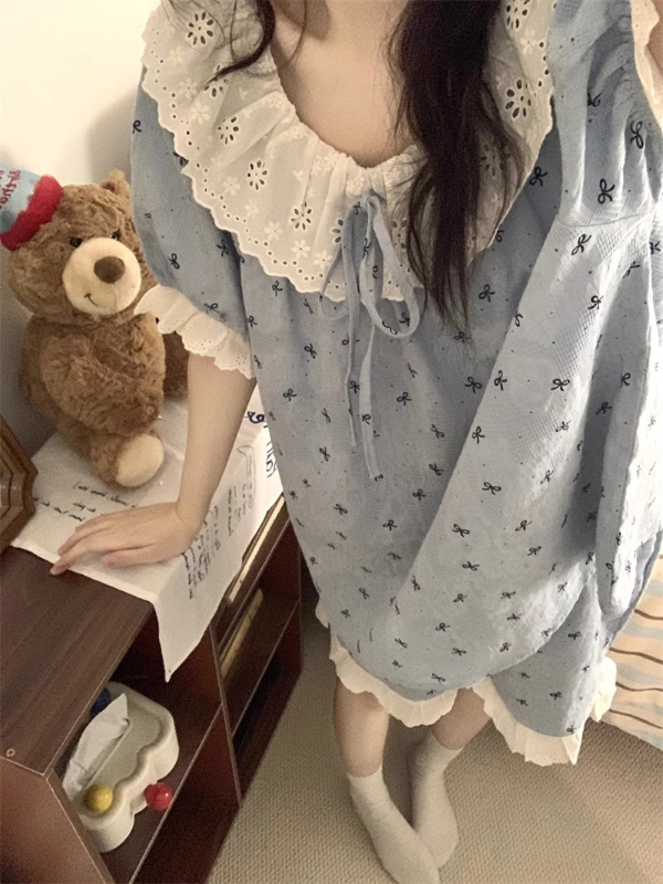 Korean sweet style pajamas set, light blue background with bow print, fresh and healing ~ lace lapel + cuffs and skirt lace, gentle and delicate . Loose version + cotton fabric, lazy and comfortable at home, put it on and you will become a sweet sleeping beauty in seconds.