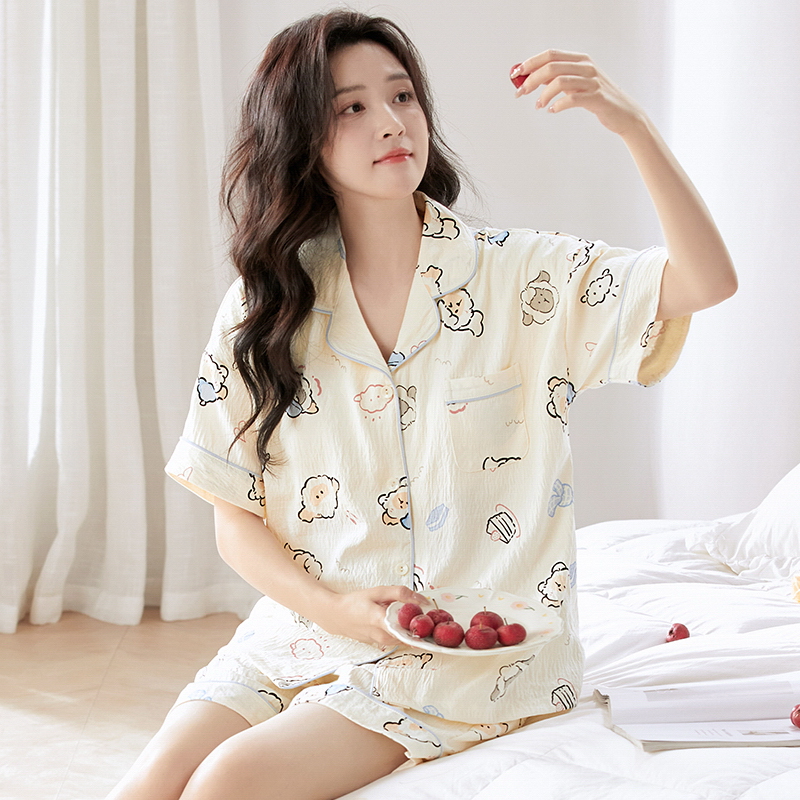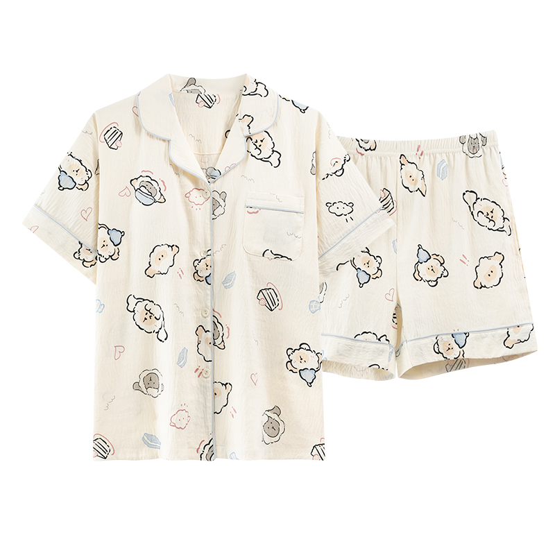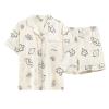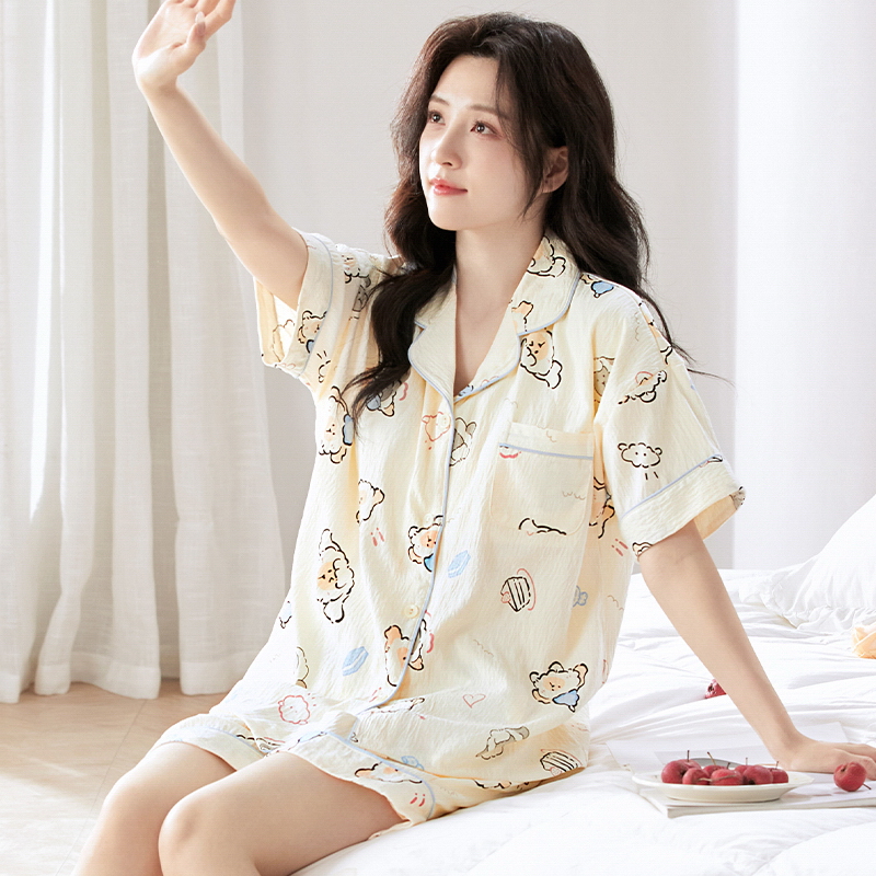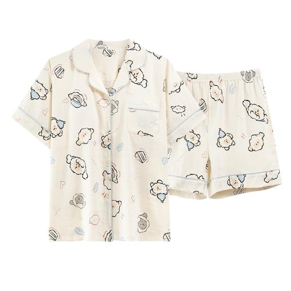 Cute and super cute pajamas, light beige background + cute bear print, age-reducing and healing ~ Pure cotton double-layer yarn fabric, breathable and skin-friendly, super refreshing in summer. Short-sleeved shorts + lapel design, comfortable for home leisure and sleeping, one-click to create a relaxing sleeping atmosphere.