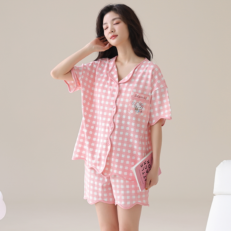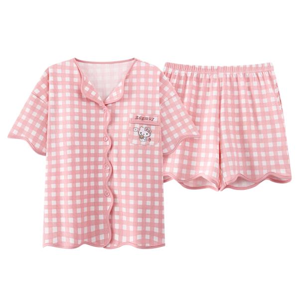 A pink checkered pajamas set that is super cute! Classic checkerboard + soft and cute Hello Kitty embroidery, full of girlishness, short-sleeved shorts design, waffle fabric is breathable and skin-friendly, and the loose version is not picky about body shape. Staying at home and sleeping will make you feel like being wrapped in a cloud~ Unlock the lazy sweet girl style with one click, whoever wears it will fall in love with it.