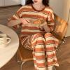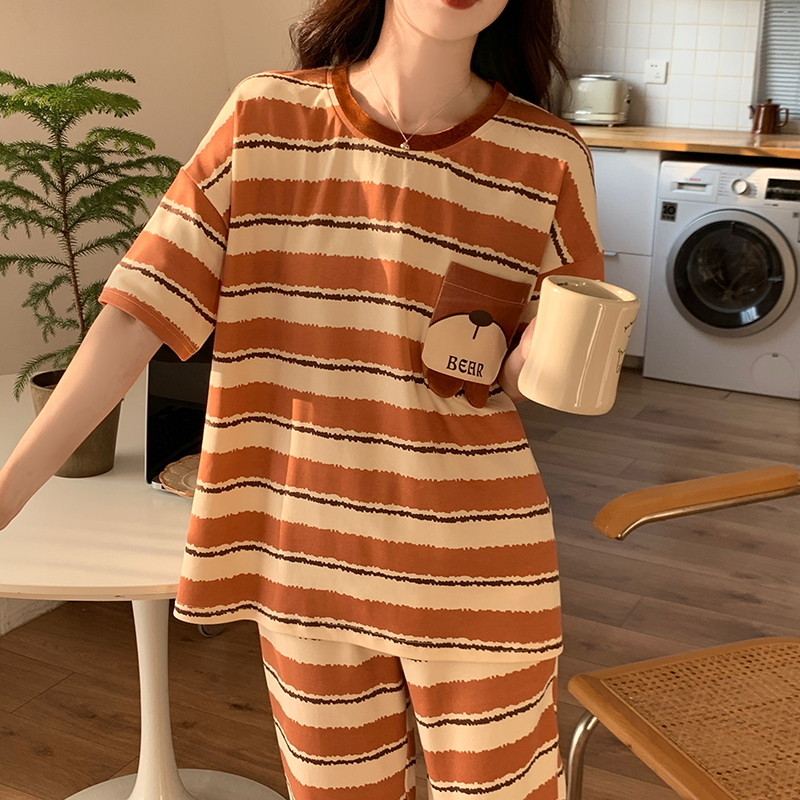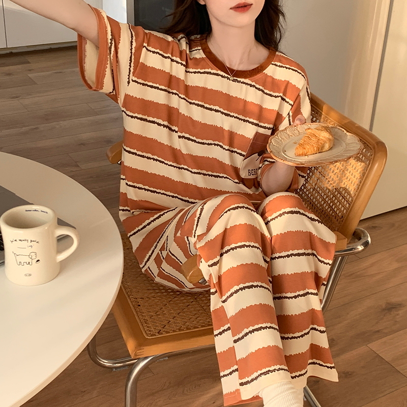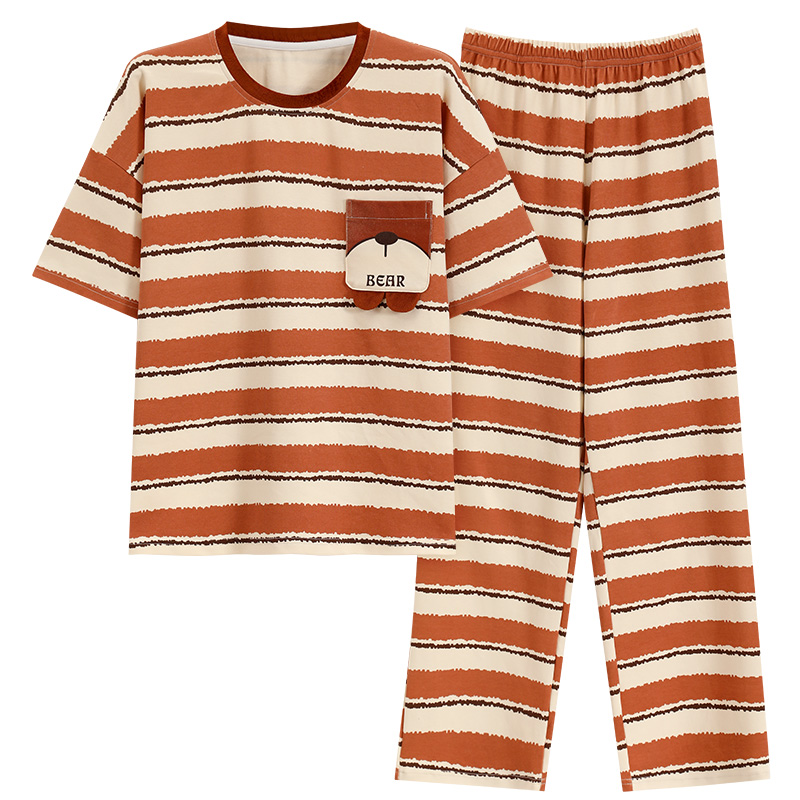 This pajama set is amazing, the orange and white stripes are classic and fresh, and the three-dimensional bear pocket on the chest is super cute. The combination of short sleeves + long pants, the fabric is soft and skin-friendly, and the loose version is comfortable and unrestrained. It is super comfortable to wear at home and to sleep, and the lazy atmosphere is maximized.