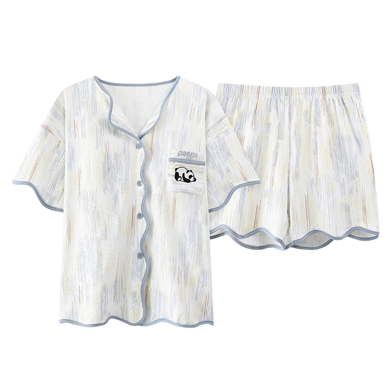 This set of pajamas is absolutely amazing, with fresh stripes all over and cute panda embroidered pockets. Short sleeves + shorts, loose but not tight, the fabric is soft, skin-friendly and breathable. Wearing it at home feels like being wrapped in clouds, lazy and healing, the first choice for staying at home in summer.