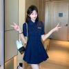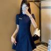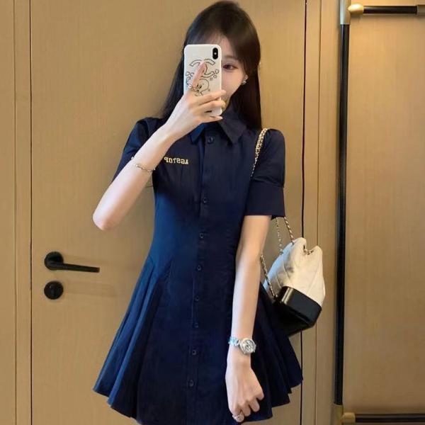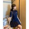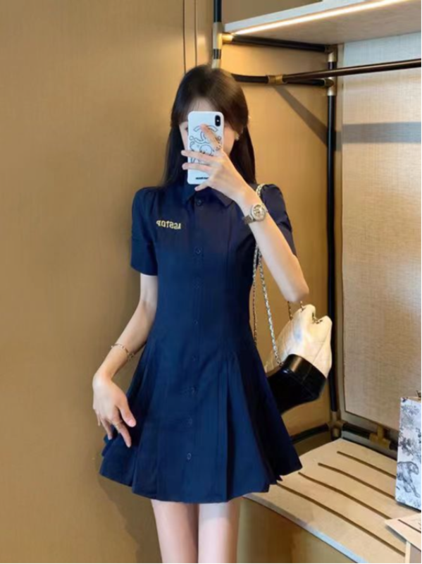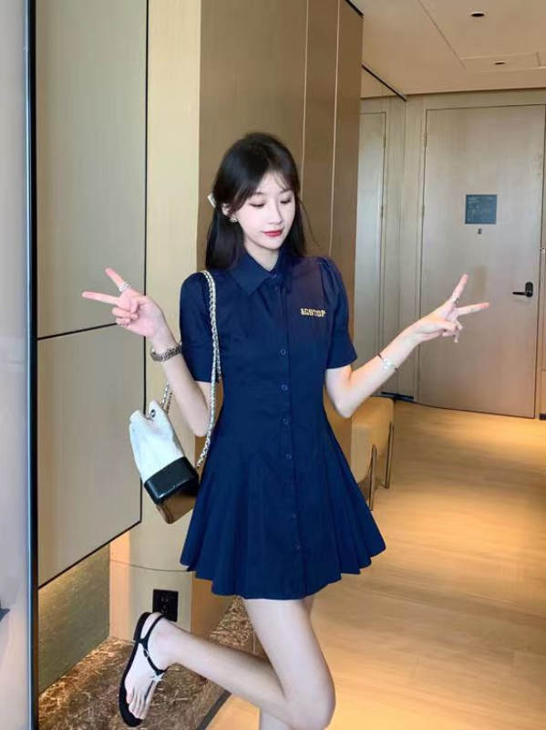Navy blue polo collar dress, puff sleeves playfully cover the flesh, waistline outlines the slender waistline, large skirt is smart and age-reducing, single-breasted, simple and neat, daily commuting, dating are all very fashionable, one-click to grasp the sweet and cool hot girl style~