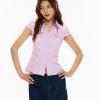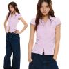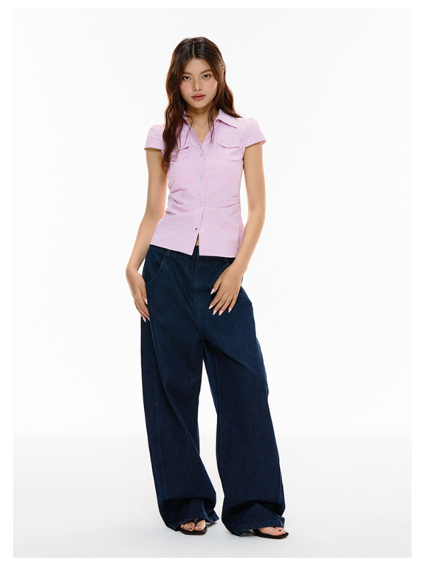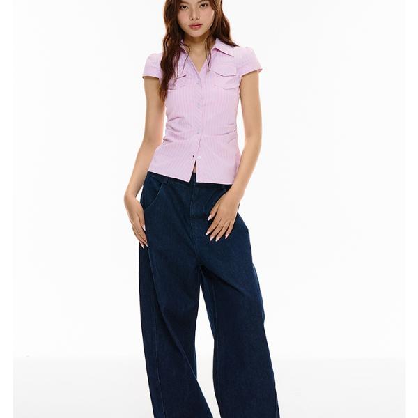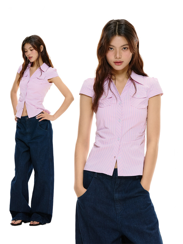 Pink striped short-sleeved shirt, lapel + double pocket design, sweet, cool and unique. The waist-hugging cut outlines the curves, neat and slim, suitable for daily street and light work. The pink and white stripes are fresh, the fabric is crisp, and it can be paired with jeans to create a sweet and spicy relaxed feeling.
