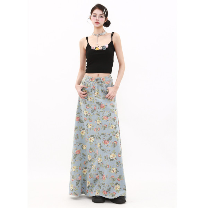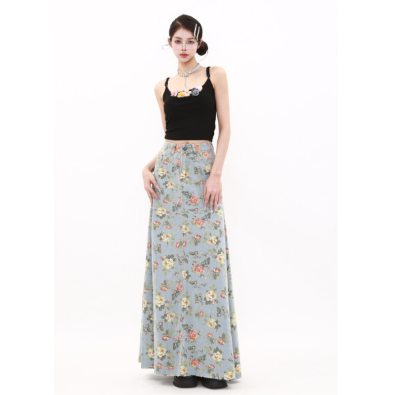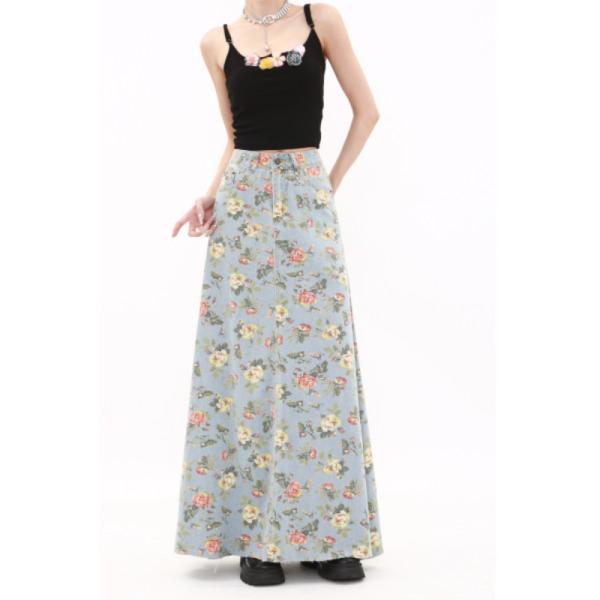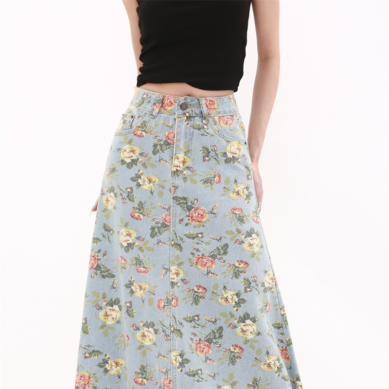 Retro pastoral style floral denim skirt, high waist design elongates the body shape, A-line skirt hides the flesh and looks smart ~ Fresh florals are spread all over the light blue denim, full of summer atmosphere. Suitable for short tops and suspenders, it can be worn for daily outings and vacations, easily grasping the relaxed and fashionable feeling, wearing "summer romance" on the body.