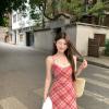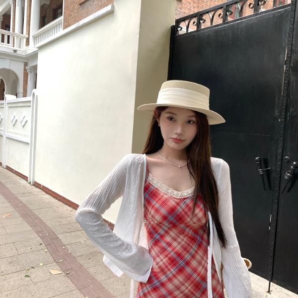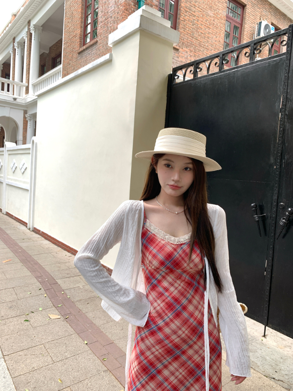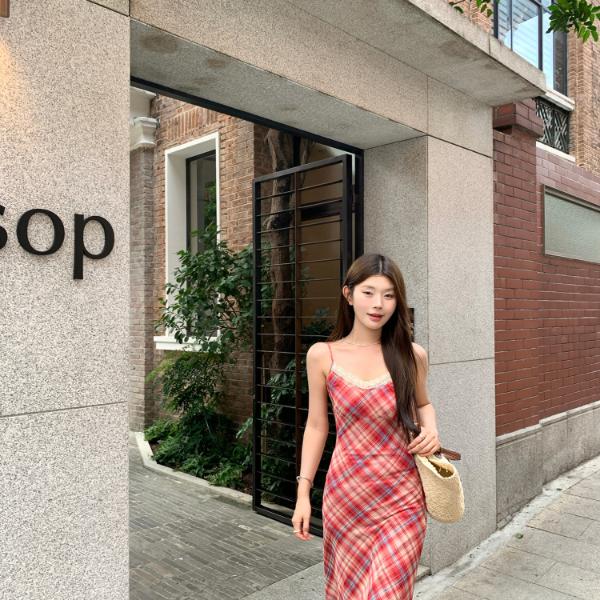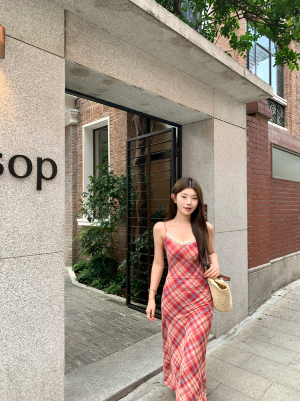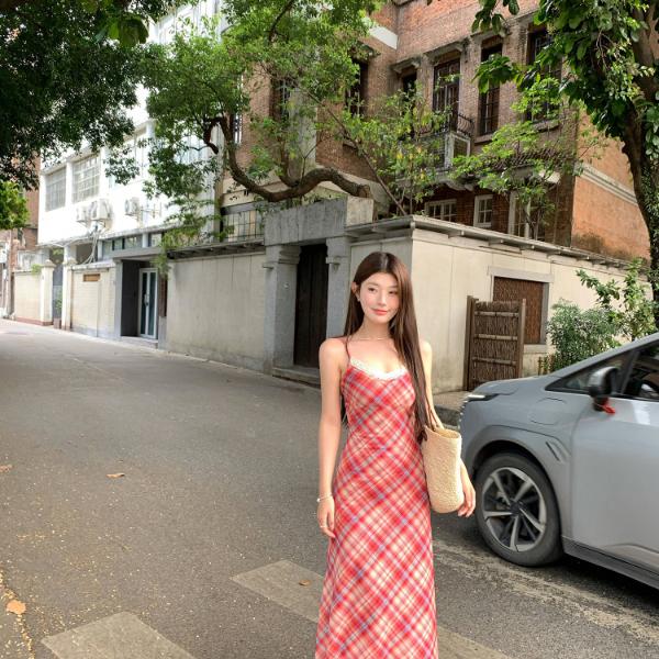 A plaid suspender skirt with a full Korean atmosphere. The retro red plaid color is very eye-catching, and the lace splicing neckline is exquisite and thoughtful. The slim cut fits the body shape and outlines the graceful curves. The long skirt makes you look windy when you walk. It is perfect for daily outings and dates. It can easily create a relaxed and fashionable look, and it is paired with a straw bag to maximize the retro feel.
