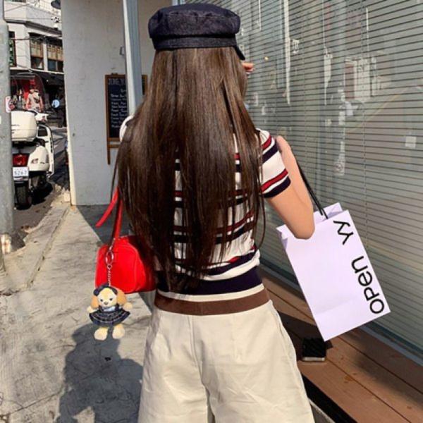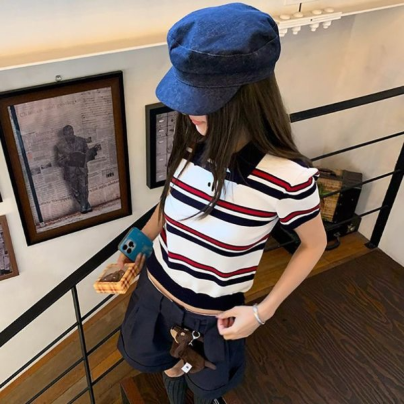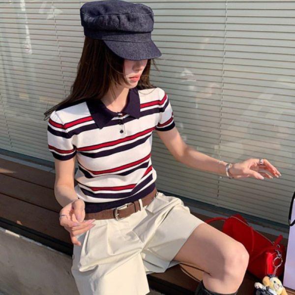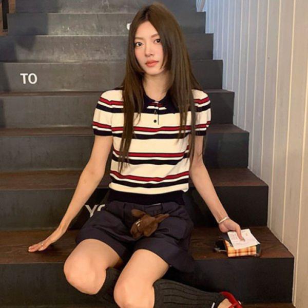 The Korean college style is mastered, and the striped Polo collar knitted short sleeves have a youth filter! The contrasting stripes are retro and eye-catching, the Polo collar makes you look younger and cute, and the short version hides the "lengthening proportion" trick~ The soft and sticky knitted fabric is skin-friendly and comfortable. It is refreshing to wear alone and can be matched with shorts/pleated skirts. It is super sweet. Wear it on the street or campus every day, and you can easily become the "heroine of a youth drama".