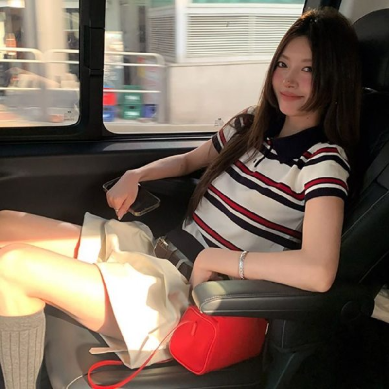 The Korean college style is precisely grasped. The Polo collar brings a youthful and age-reducing feeling, and the contrasting stripes reproduce the retro campus atmosphere, which fits the young people's yearning for "the outfit of the heroine in youth dramas" and easily creates a relaxed and fashionable campus feeling.