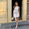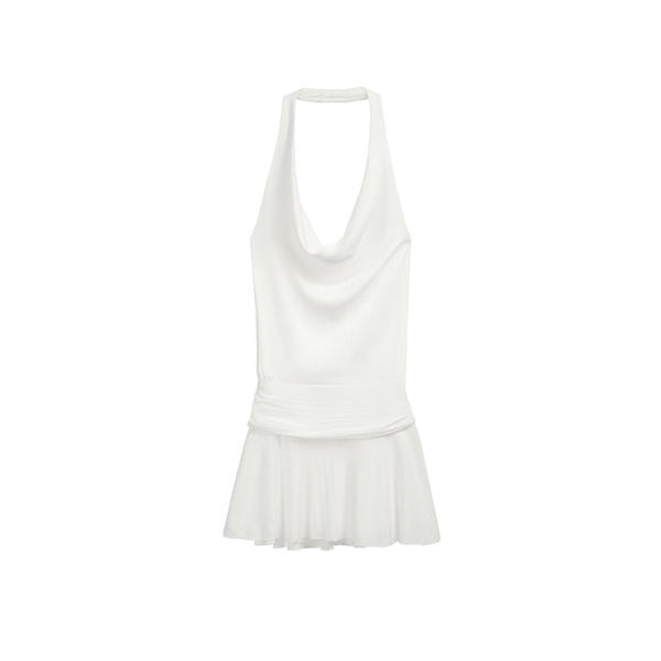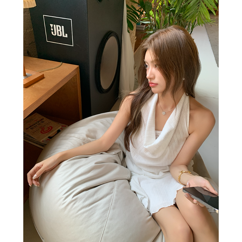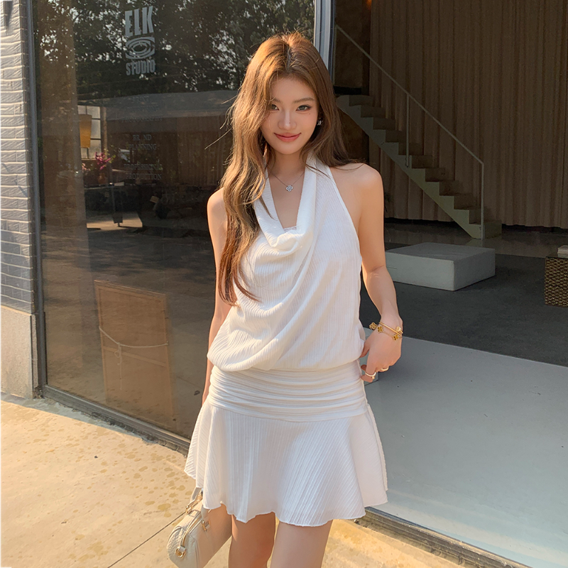 Korean pure - desire style set, featuring a halter cowl - neck top + pleated mini skirt. Sleeveless design is fresh for summer, cowl neck outlines soft shoulder and neck lines; high - waisted skirt elongates legs, and drooping pleats add flexibility. All - white tone brings a cool atmosphere, suitable for daily streetwear and dates, easily capturing relaxed fashion.