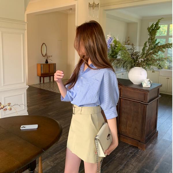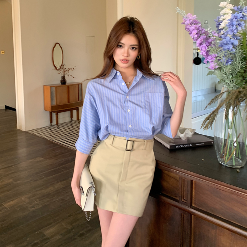 Korean style loose blue and white striped mid-sleeve shirt, classic striped elements, refreshing and not monotonous. The mid-sleeve design is suitable for multiple seasons, the simple lapel is neat and elegant, and the loose version hides the flesh and is comfortable. It is casual and casual to wear alone on a daily basis, and it can be paired with a skirt or pants to switch between commuting/going out styles. It is a basic and versatile style for creating Korean style outfits, and it can easily create a fresh atmosphere.
