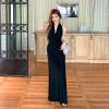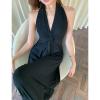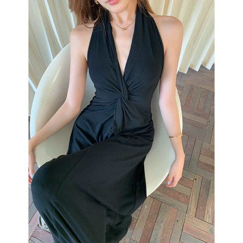 The French halter neck V-neck black long skirt has an elegant filter. The deep V design outlines the shoulder and neck lines, the halter neck element adds a sexy touch, the slim fit fits the body shape, the long skirt is full of temperament, and it walks with the wind~ Wear it for daily dates and dinner parties, match it with a simple bag, and easily grasp the aura of "rich and beautiful women in the world", and the sense of luxury overflows the screen.