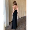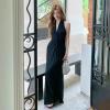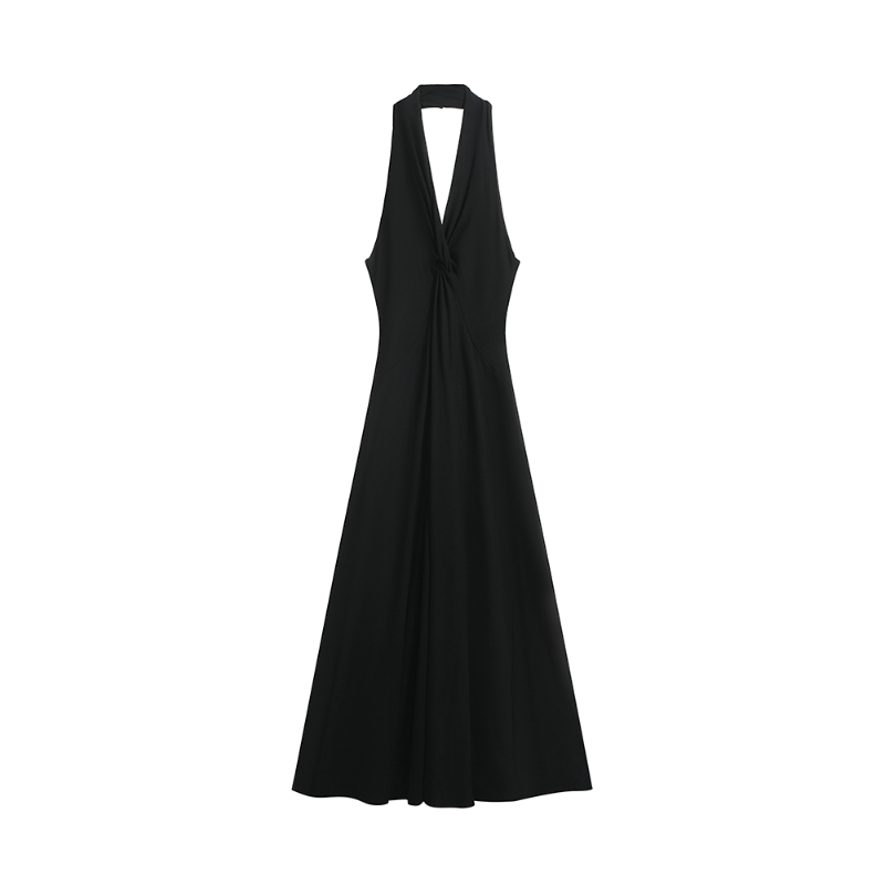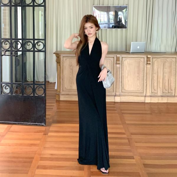 The halter neck + deep V-neck combination reveals the shoulder and neck lines and weakens the heavy feeling of the shoulders; the slim cut fits the body shape, and the long skirt drapes naturally, swaying while walking, giving it a "noble filter".