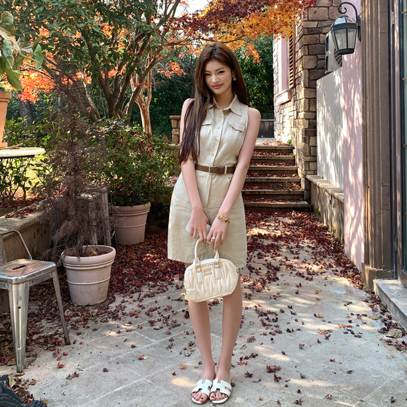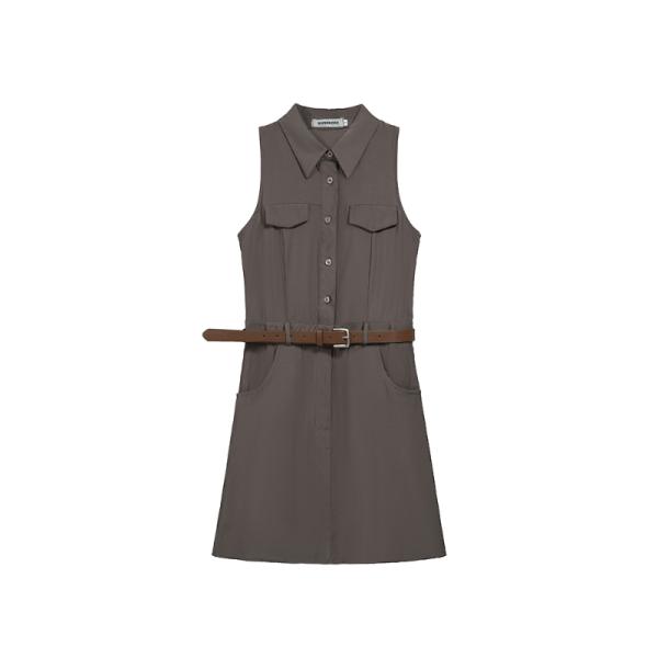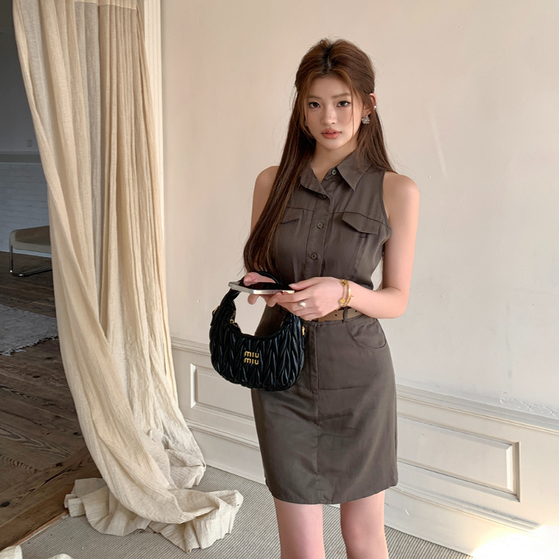 Workwear-style sleeveless shirt dress, dark grey tone brings out a capable temperament. The lapel design is neat and stylish, the button opening and closing is simple and generous, and the double-sided pockets are both practical and fashionable. With a brown belt, it can easily tighten the waist and show the curves, suitable for commuting in the workplace and going out on the street every day. The fabric is comfortable and crisp, not picky about body shape, and the dress unlocks a simple and high-end feeling, which is the "worry-free king" in the summer wardrobe.