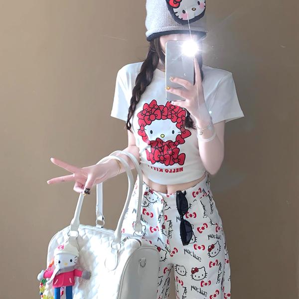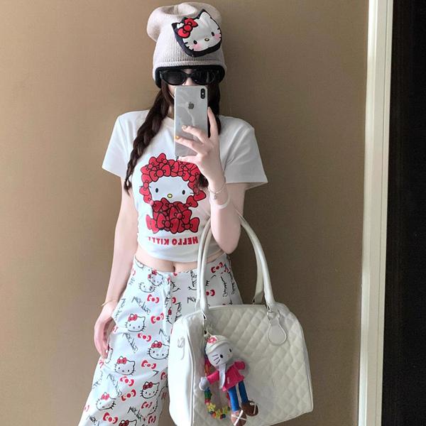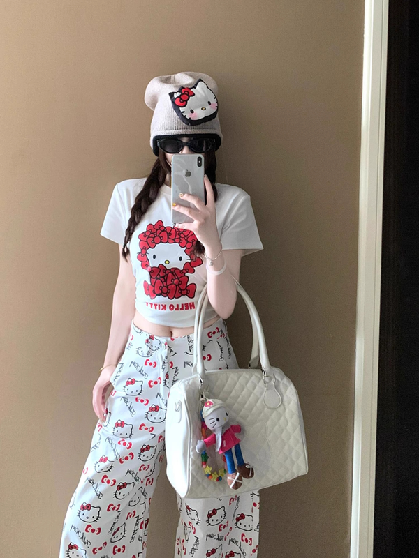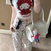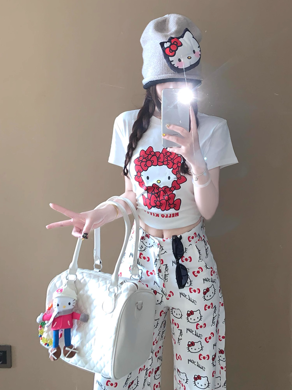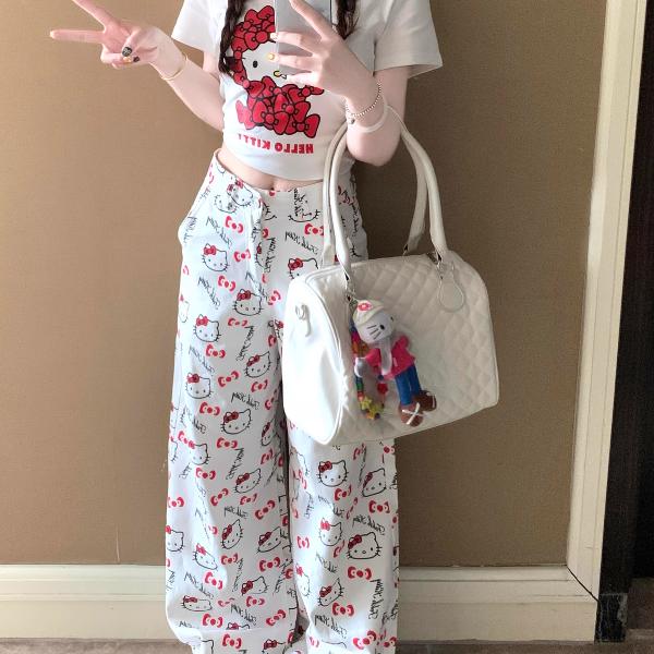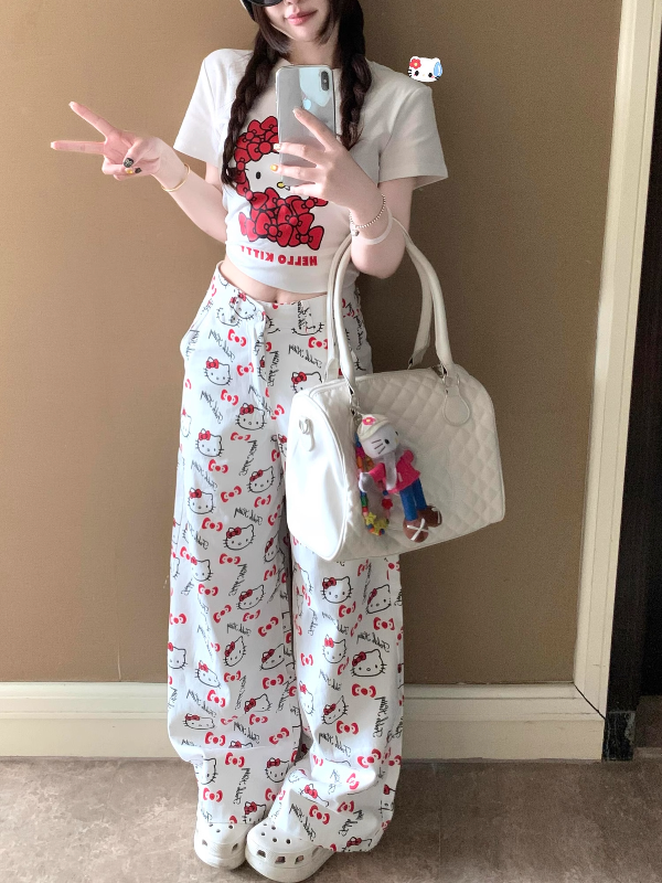 Cartoon cute cat print white wide-leg pants loose lazy style versatile slim jeans
