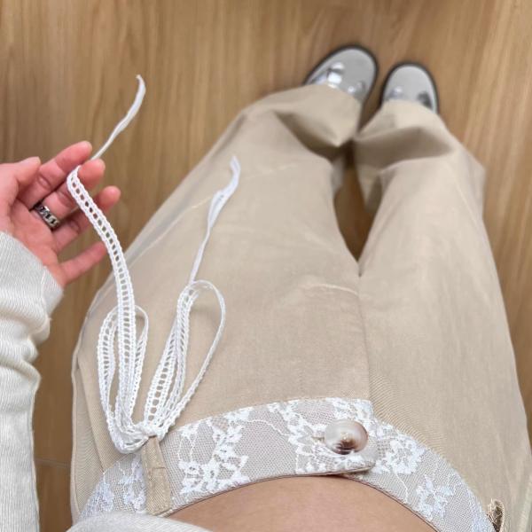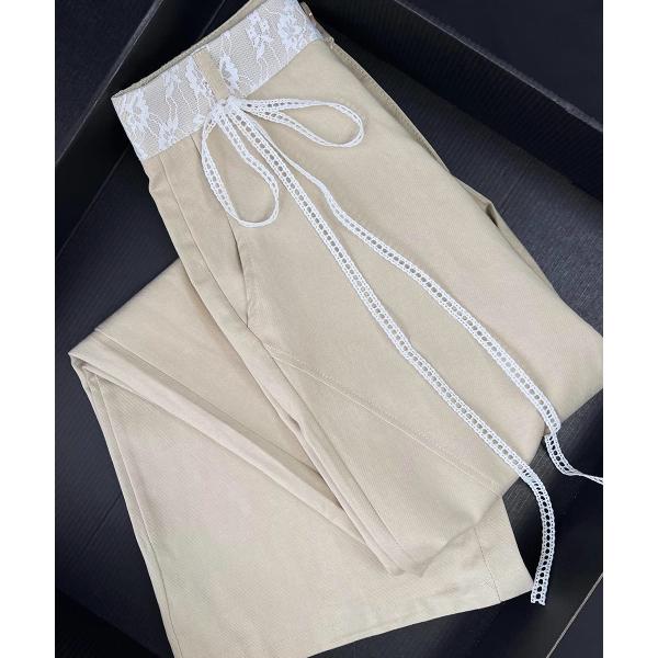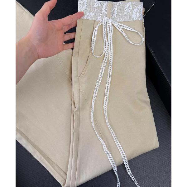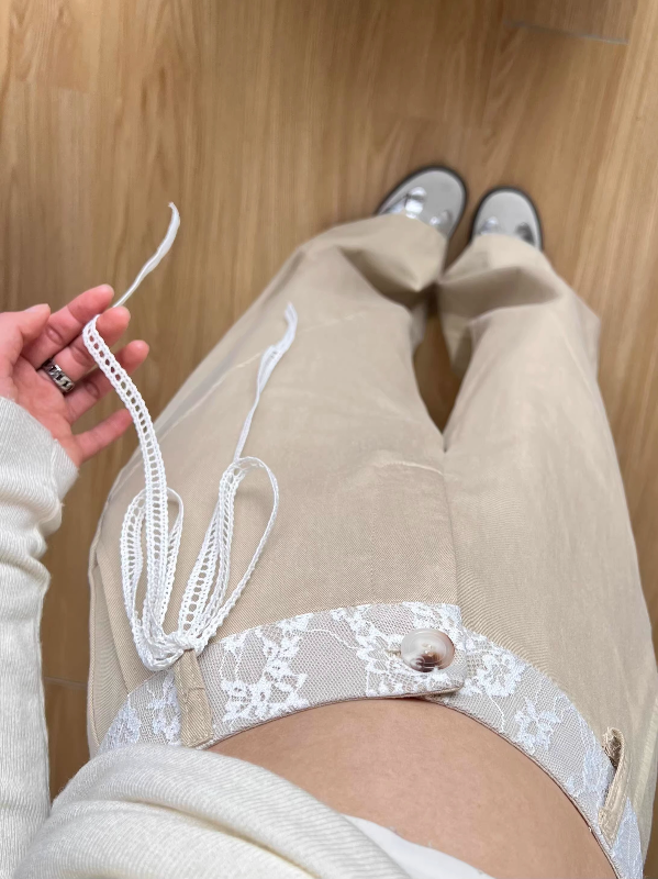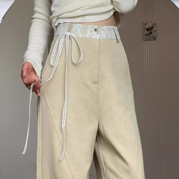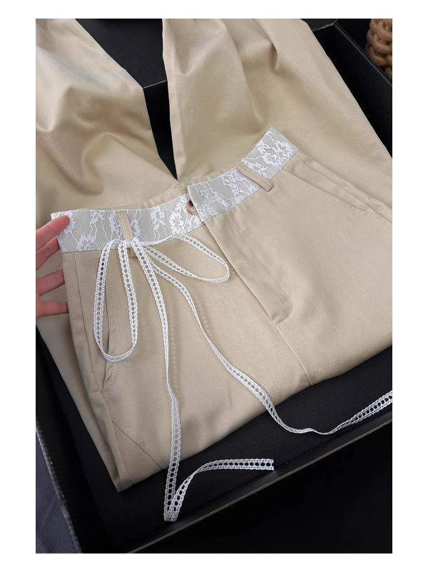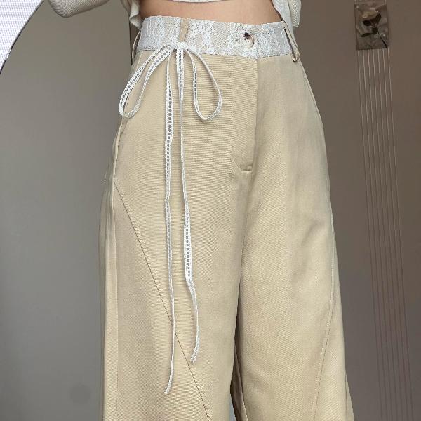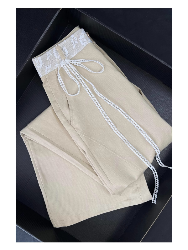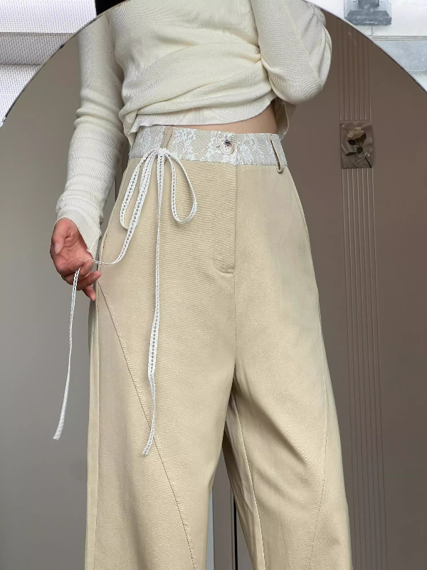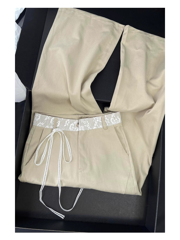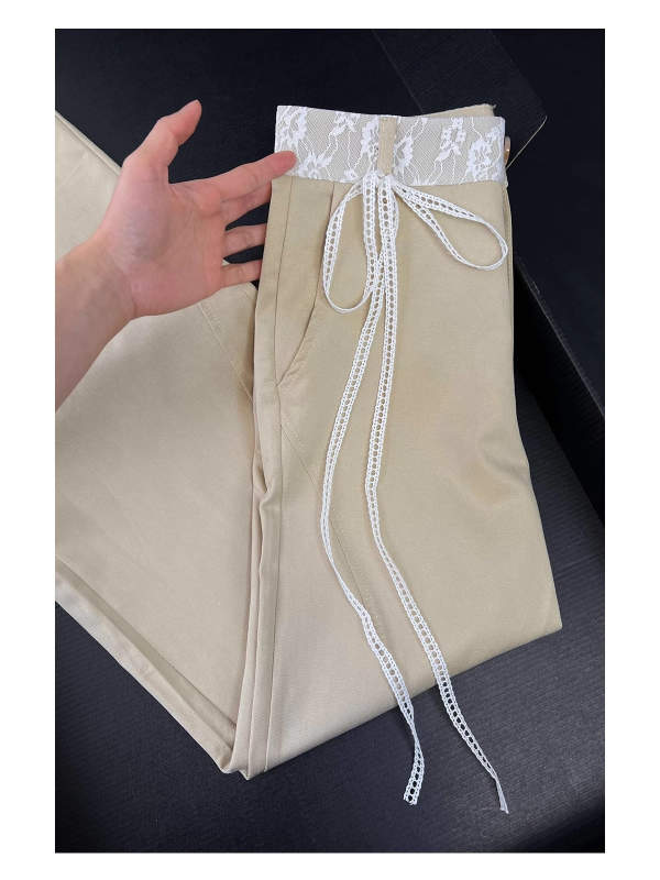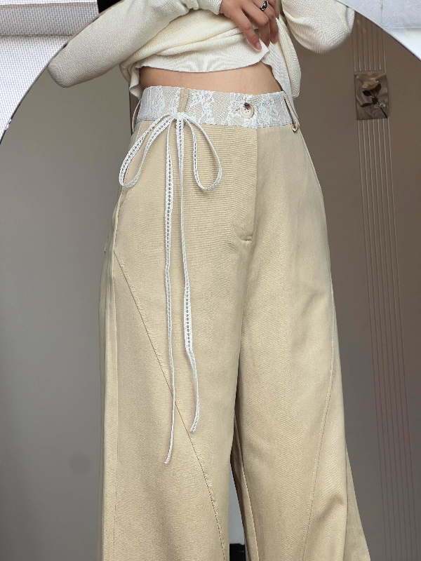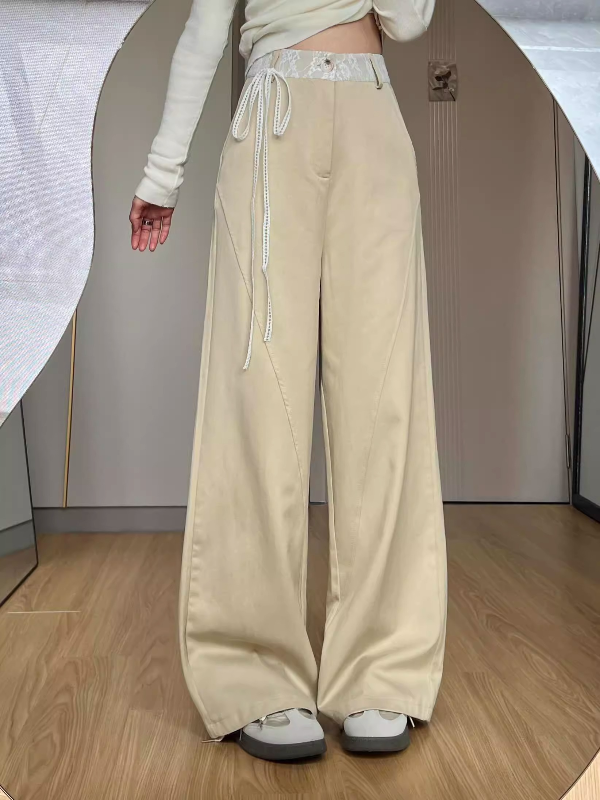 Khaki lace stitching high waist casual pants women's straight wide leg pants mopping trousers