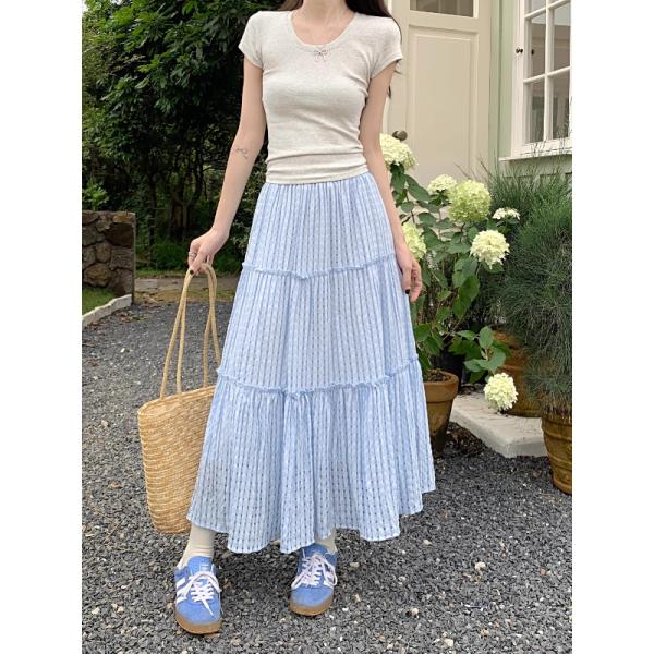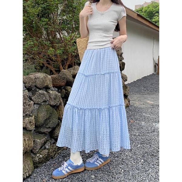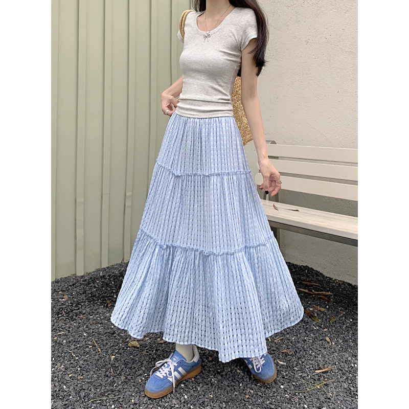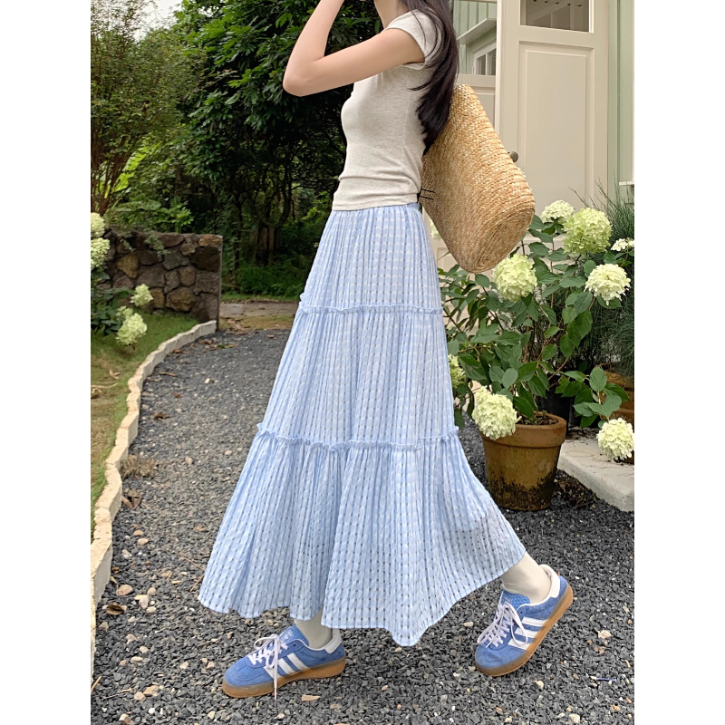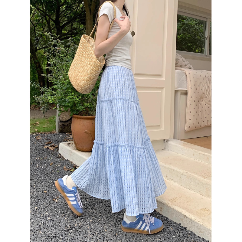 Blue plaid cake skirt skirt women's summer a-line long skirt forest skirt umbrella skirt seaside outfit suit