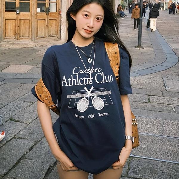 Eye-catching navy blue T-shirt with letter prints unlocks the low-key and personalized fashion code