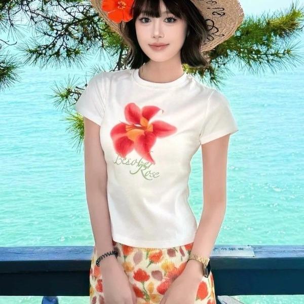 Summer holiday style flower print short sleeve T-shirt | Slim short sweet top for women