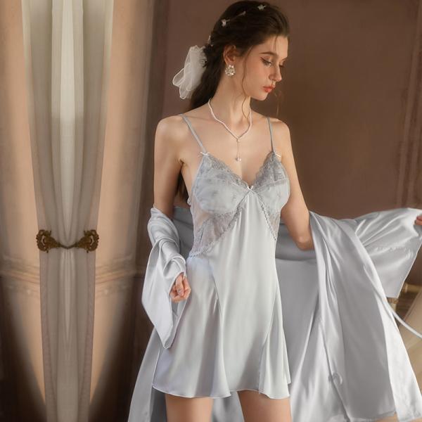 Princess style satin pajamas set | Lace patchwork suspender skirt + loose outer wear