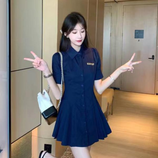 Korean style simple polo skirt | navy blue waist slimming | short sleeve dress