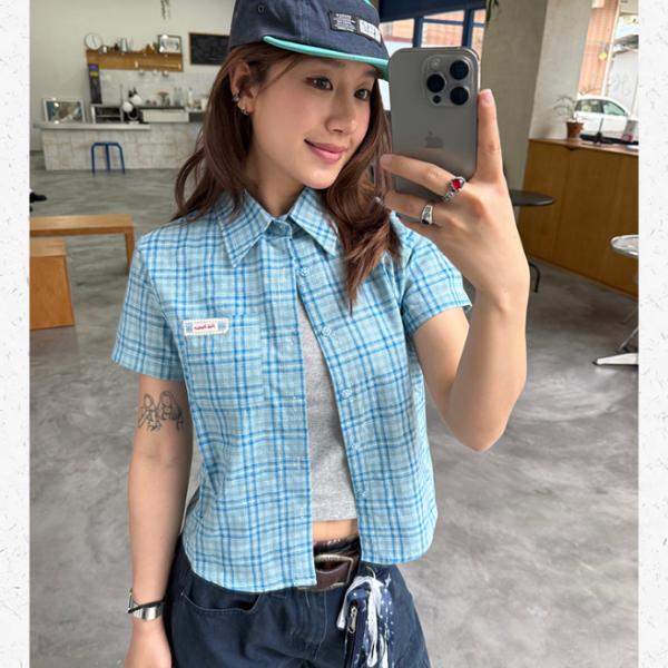 Retro blue plaid short-sleeved shirt | Short lapel college style top | Japanese fresh blue plaid shirt