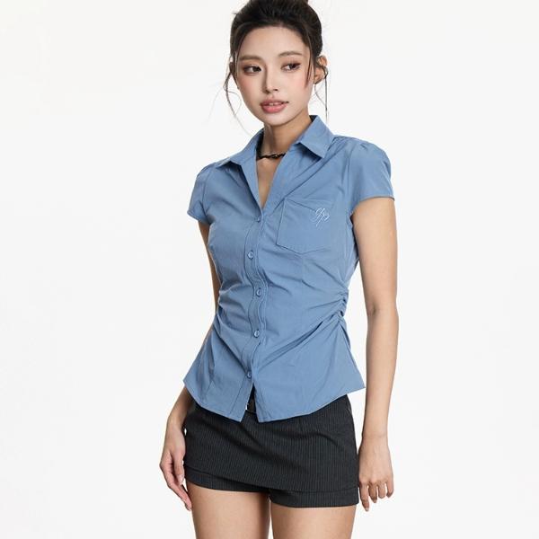 Blue short-sleeved waist shirt | Simple lapel | Suitable for both work and daily wear