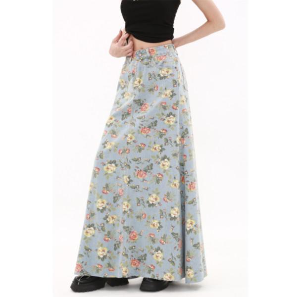 American pastoral style! Floral denim long skirt | High waist slim retro girly skirt