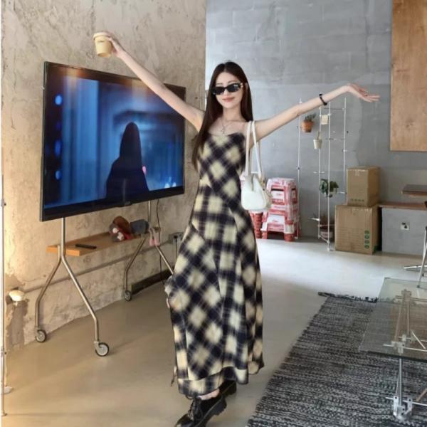 Korean style! Plaid suspender dress | Waist-length slit holiday style long dress