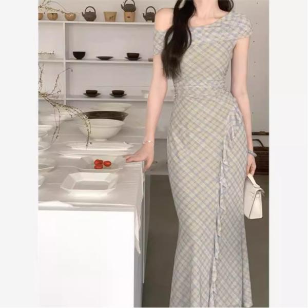 Pure desire style summer plaid dress for women | Slant collar, off-shoulder, waist-slimming long dress | High waist and wide swing sexy dress that covers the belly