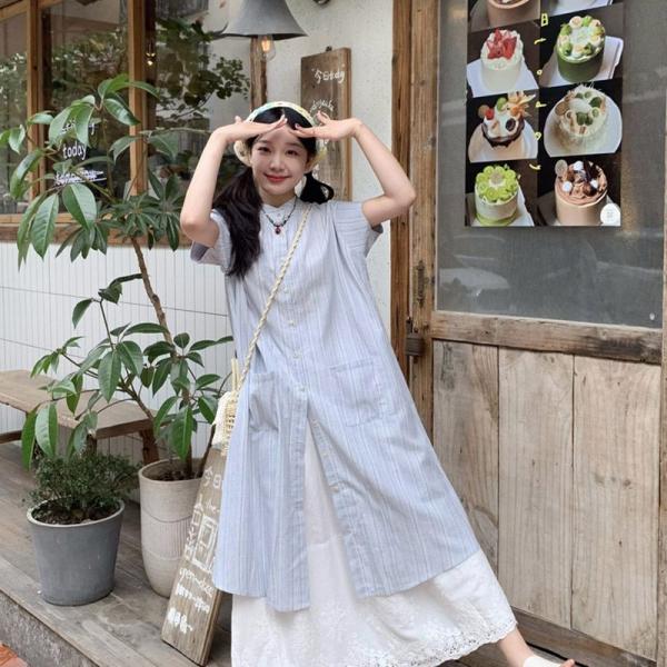 Japanese girlish striped shirt dress 2025 spring wear sweet lapel waist dress tall and slim commuter robe