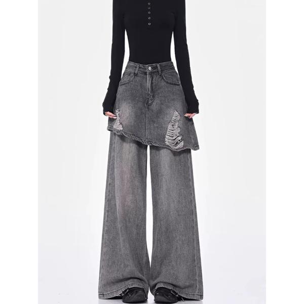 Women's 2-in-1 Skirt Jeans - High Waist Flared Palazzo Pants with Distressed Hem, Stretch Denim