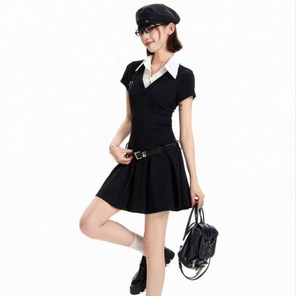 American retro fake two-piece polo skirt | Black preppy style pleated dress