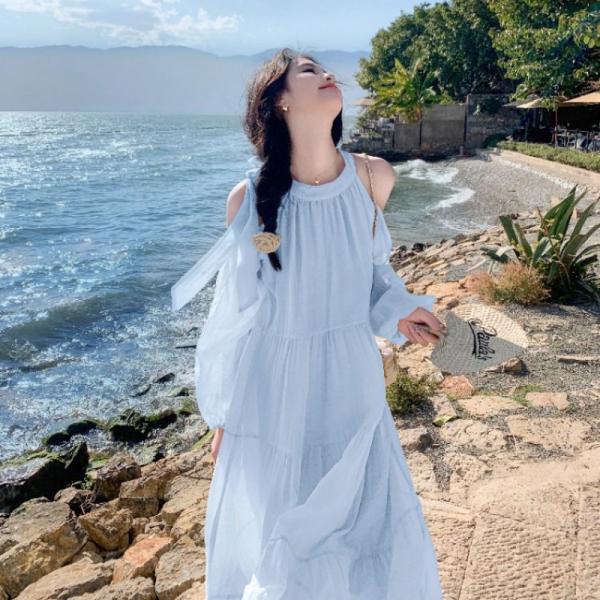 [French romance] Gentle off-shoulder fairy dress Loose and slim holiday long dress Beach dress