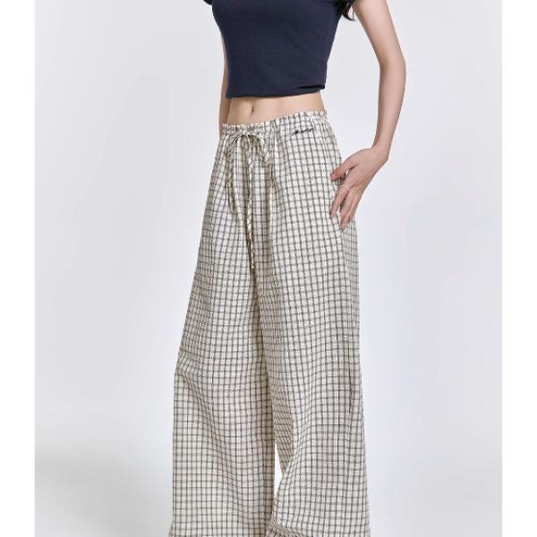 Women's Plaid Wide - Leg Pants 2025 New Casual Loose High - Waist Drawstring Trousers