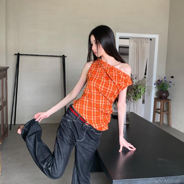 Bright Plaid Asymmetric Top | Vintage Off-Shoulder Slim Blouse for Party Night | Retro Feminine Fashion