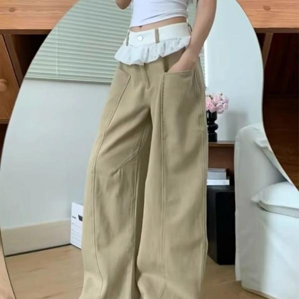 Maillard style khaki high waist ruffled wide leg pants Loose and slim large pocket women's pants