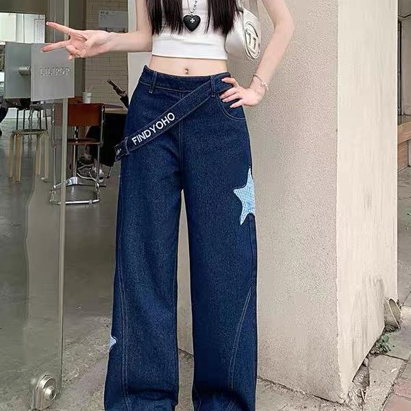 Denim wide-leg pants Star patch oblique button High waist slim European and American style trousers