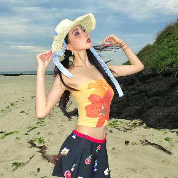 Women's Summer Beach Bandeau Top, Big Red Flower Print Strapless Crop Vest
