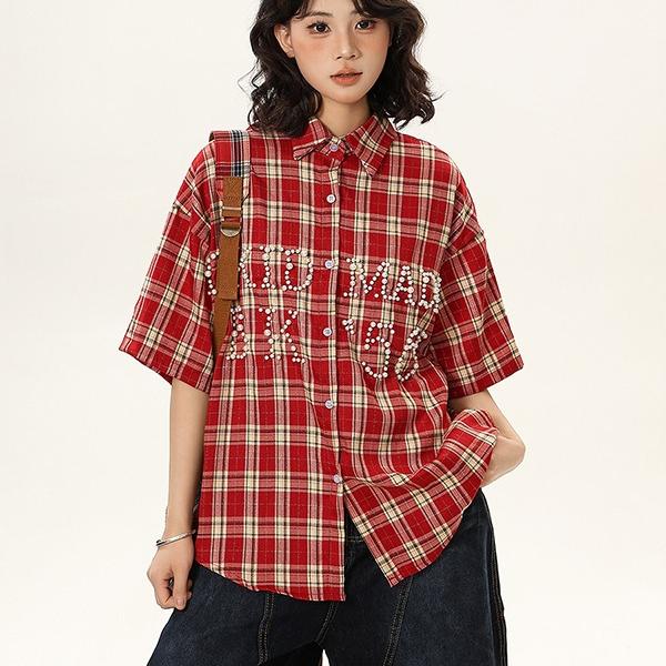 2025 Vintage Hong Kong Style Red Plaid Shirt | Women's Short Sleeve Peter Pan Collar Loose Fit Blouse