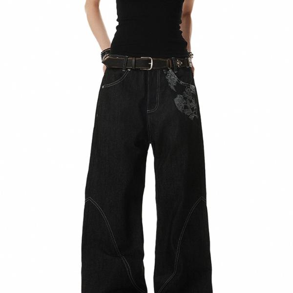 American trendy floral embroidered jeans High street straight wide-leg pants Niche designer trousers